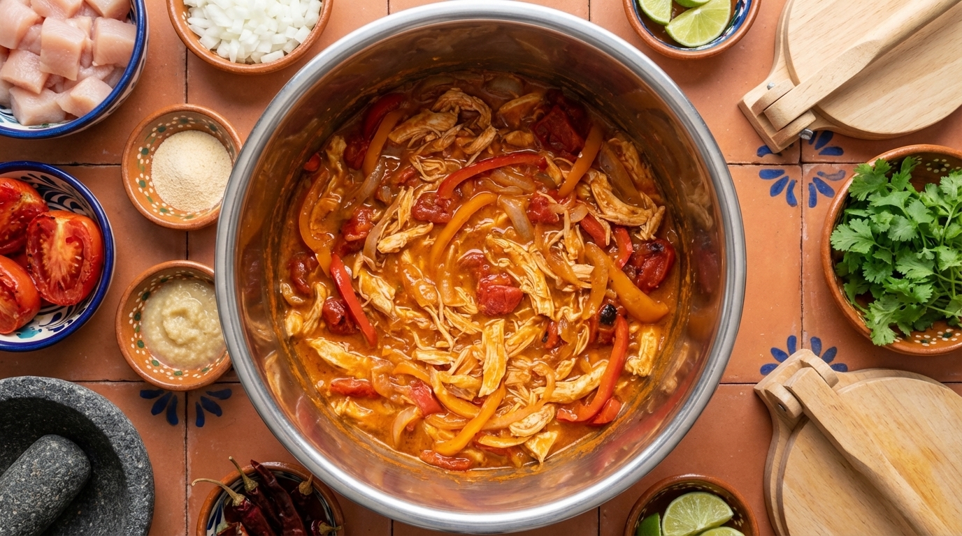 Snijd de kipfilet in blokjes en voeg toe aan de slow cooker met rode enchilada saus, groene pepers, geroosterde tomaten, knoflookpuree, uienpoeder, zout, zwarte peper en cayennepeper. Roer om te coaten. Voeg geroosterde groenten toe. Dek af en kook op high voor 2-3 uur of low voor 3-4 uur tot ze gaar zijn.