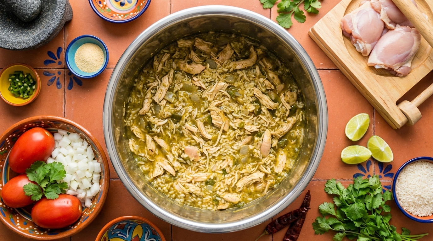 Plaats de kippenbouten in de slow cooker. Voeg taco kruiden, limoensap, kippenbouillon, groene enchiladasaus, knoflookpoeder en zout toe. Roer goed om alles gelijkmatig te bedekken. Dek af en kook op high gedurende 2-3 uur of low gedurende 3-4 uur, totdat de kip mals is en gemakkelijk kan worden gescheurd.
